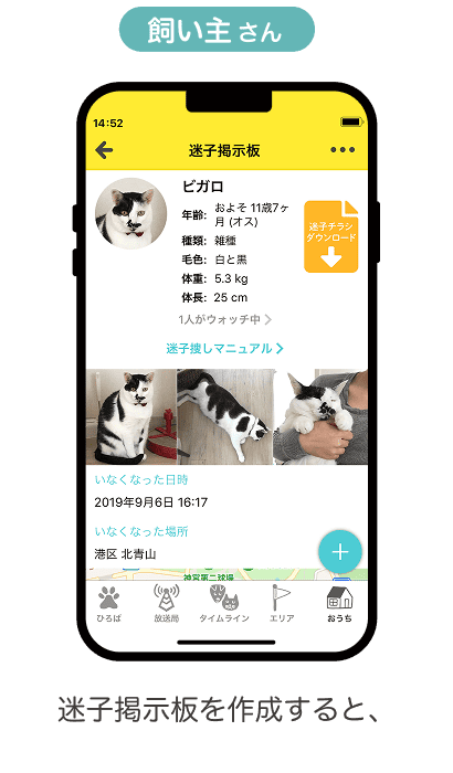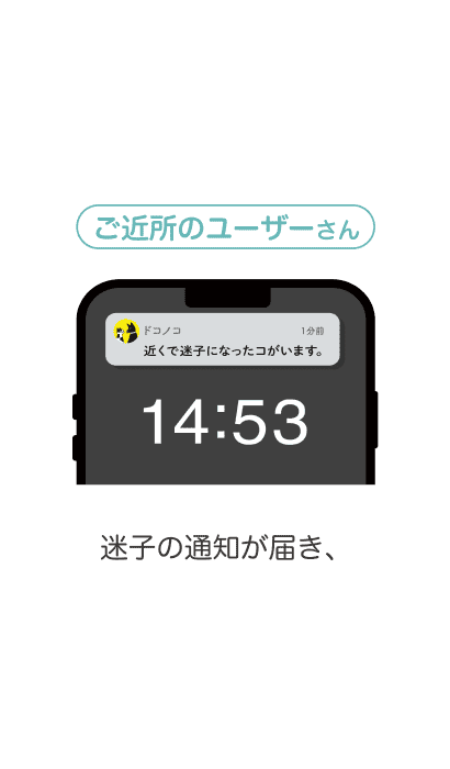 迷子掲示板が公開されると、半径4km圏内にいるユーザーに迷子のお知らせが届きます。迷子捜しの協力を呼びかけてください。