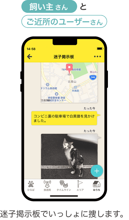そこで、万が一うちのコが迷子になったときには、位置情報を利用して、ご近所のユーザーへ通知。