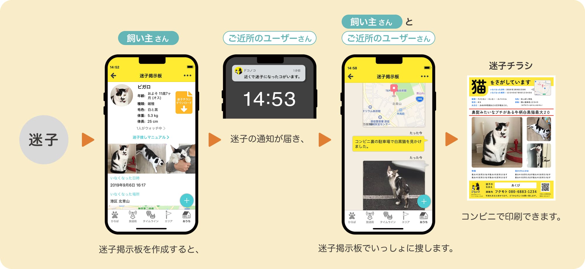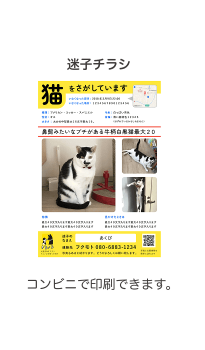 ●また、迷子掲示板を作成すると迷子チラシの原稿が自動でつくられますので、コンビニなどで印刷して、すぐに近所に配ることができます。