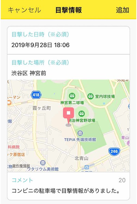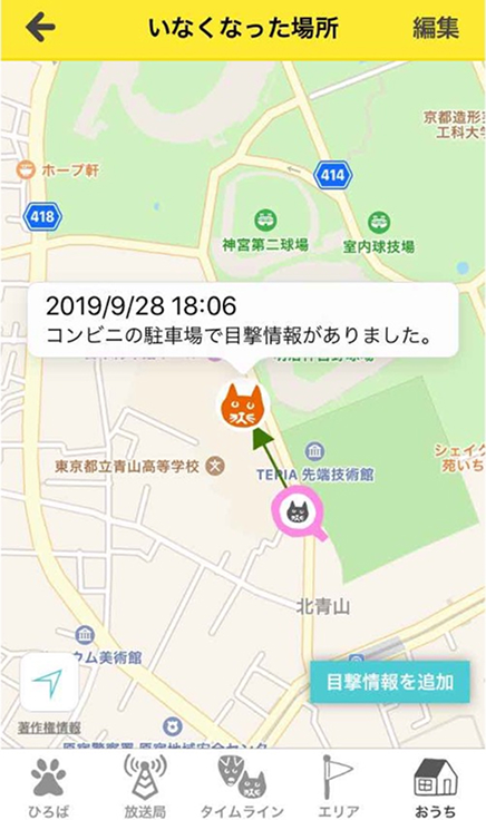 共有ユーザーは飼い主さんの代理として、迷子情報を編集したり最新の目撃情報を地図に追加したりすることができます。