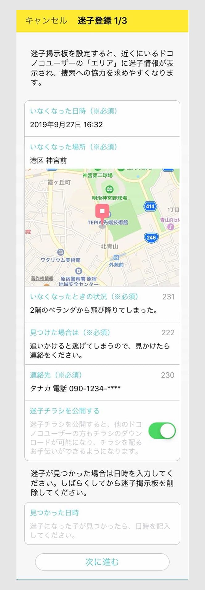 いなくなったときの状況や、連絡先を変更することができます。