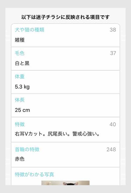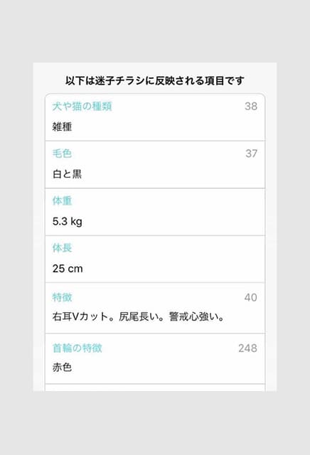 迷子になってからの日にち、飼育環境、性格などの質問に答えていくと、