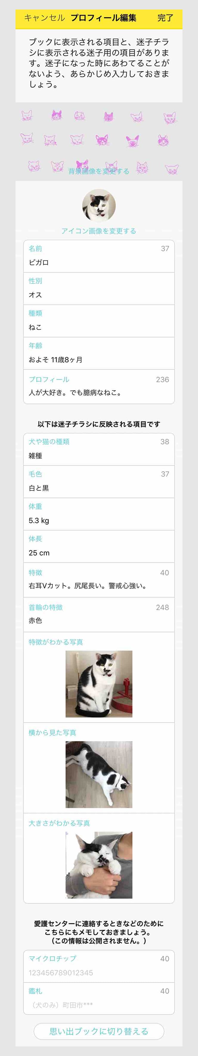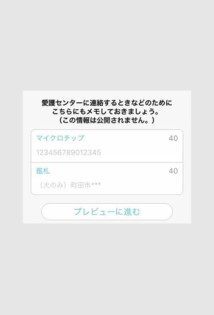 ●どうぶつブックを作成したら、迷子チラシに使うプロフィールを入力します。