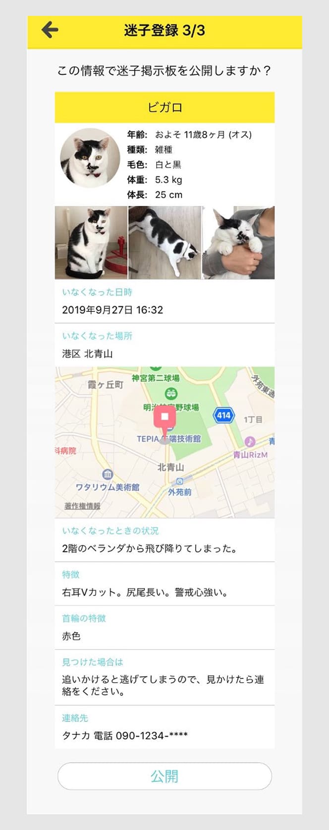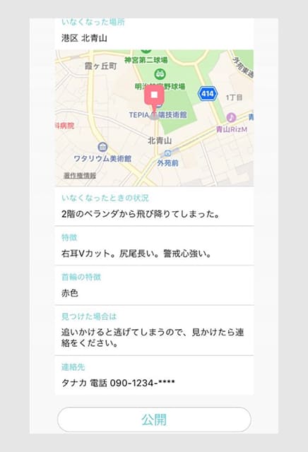 ●内容の確認がすんだら、「公開」を押してください。 迷子掲示板が公開され、ご近所のユーザーさんに迷子のお知らせが届きます。