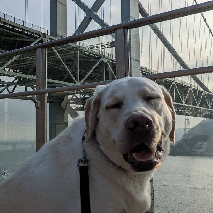 題「関門海峡とボク」 今日は家族と福岡に行きました。門司港では人気者になったよ。