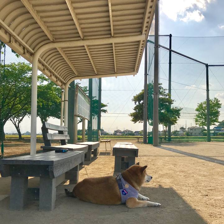 今日は病院なので早めにお散歩🐕 でも暑くて早速休憩😅 #柴犬 #ベンチ部員