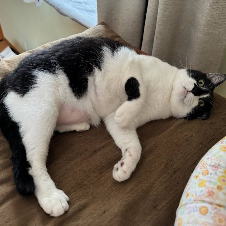 もーちゃん、おなか ぺよぺよしすぎじゃね? #たゆんたゆん #白黒 #マスク猫