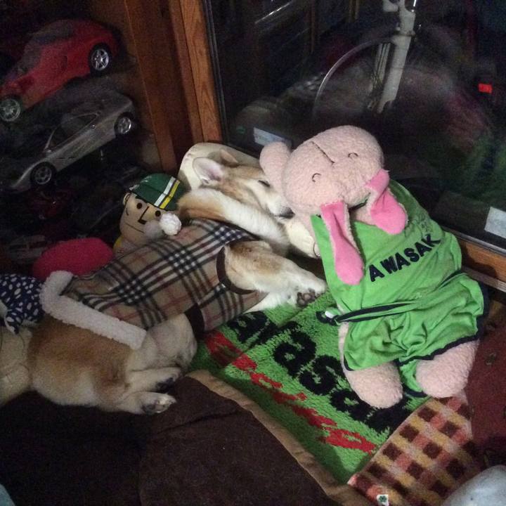 とてもお疲れのようです💤 #コーギー #ぬいぐるみ #なかよし