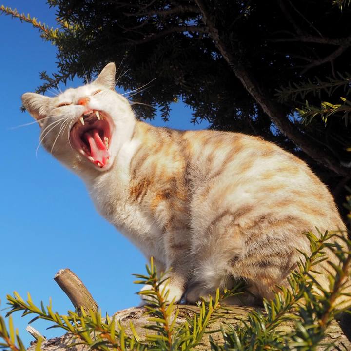 にゃは〜〜〜 #三毛猫 #木登り #青空 #あくび