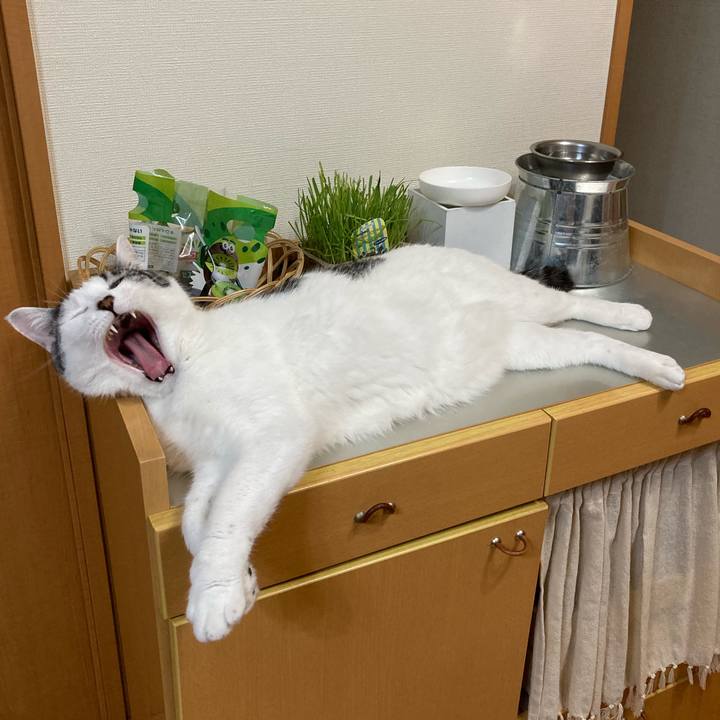 #サバ白#鯖組 #ねこ句 大あくび ここの枕は 最高ニャ やっと激写できた😆