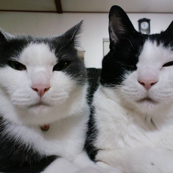 おはにゃん🌞 眠そうねぇ… #ハチワレ #なかよし #灰白 #白黒 #なかよし