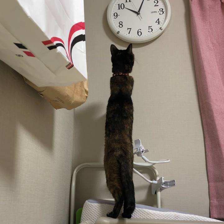 蓮は時計が好き。ベッドの高さをマックスにしてあげたら喜んで立っちして見てる。
