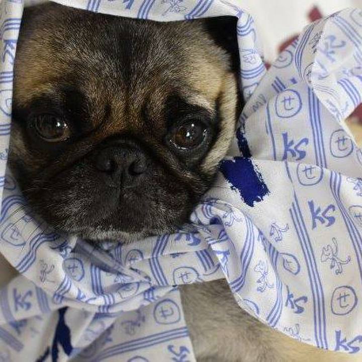 この手ぬぐいは 梅子の両親がファンの斎藤和義さんのなんだよ🐕😀 #パグ
