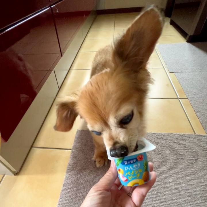 ちょびっとのヨーグルトに必死です🐶😳 #チワックス#ミックス犬#シニアの底力