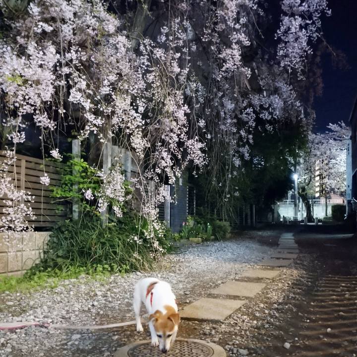 今日も今日とて夜遊び夜桜🌸垂れ過ぎ〜😂 #ジャックラッセルテリア
