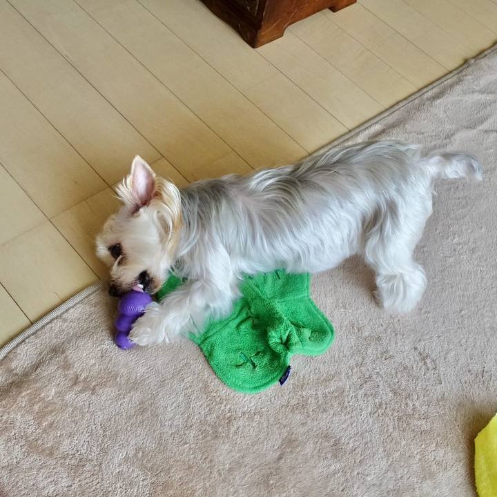 オリンピック並の闘魂見せる犬 #いぬ句 #ヨーキー 冷凍したちゅーる入りコングに