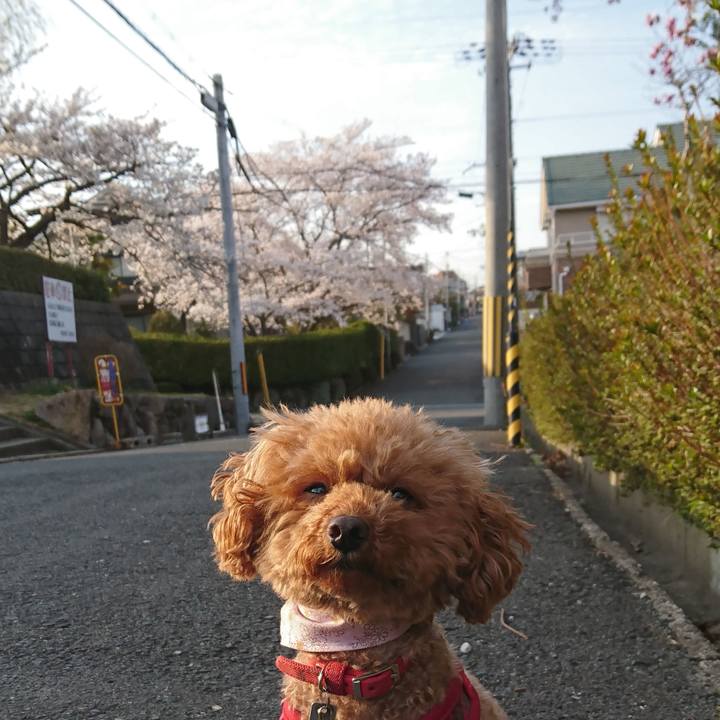 ゆうんぽも お花見🌸散歩が 出来ました😊 #トイプードル #さんぽ #いぬ句