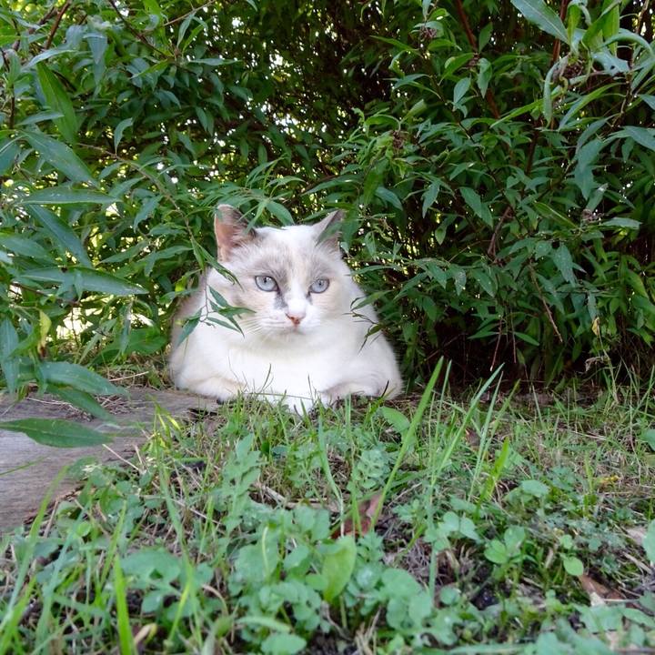 草むらの中に入ってぷち(犬)を警戒するミズさん。 #三毛猫