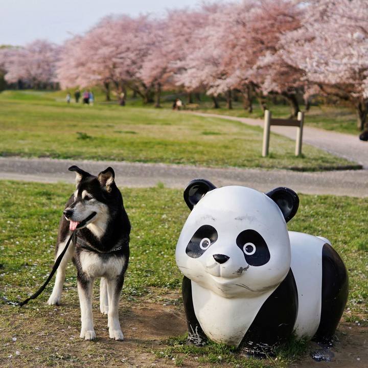 白黒コンビと🌸 #桜#お花見#オブジェ#パンダ#雑種犬