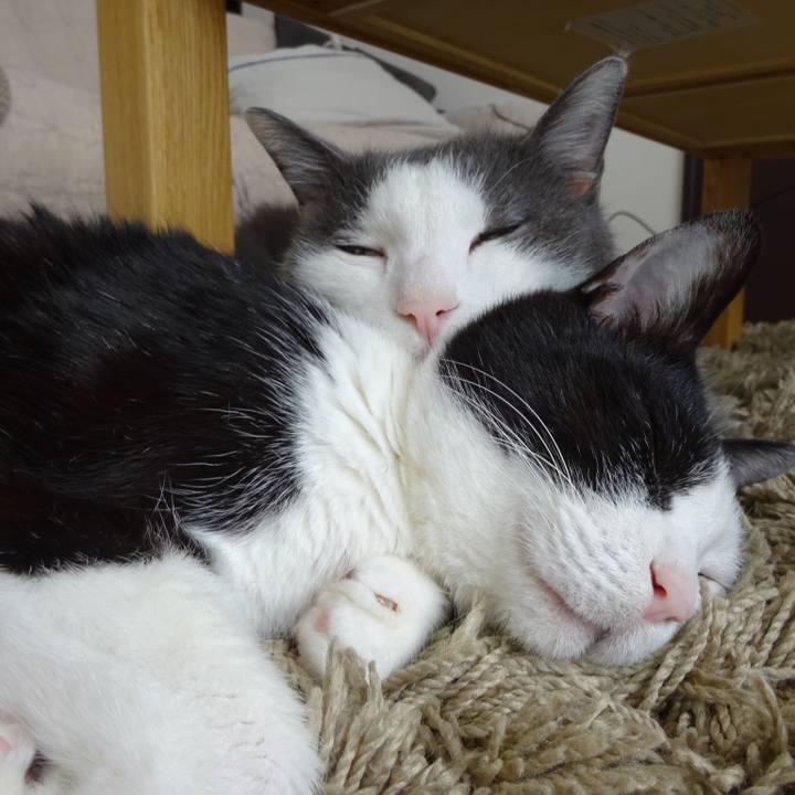 おはにゃん ☔️ザーザーでねむいにゃん…💤 #ハチワレ #灰白 #白黒