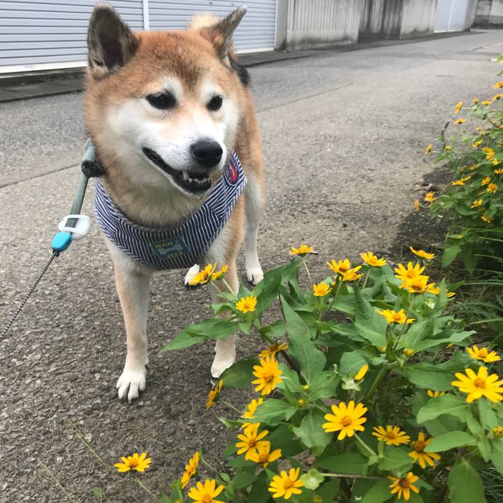 道端のメランポジウムが可愛いね😊🌼 #柴犬 #花便り#メランポジウム