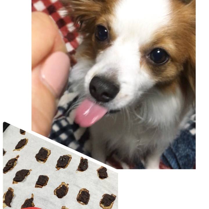 でたな❗️妖怪舌なめずり👀#パピヨン#手作りおやつ ビーフジャーキーです🤗