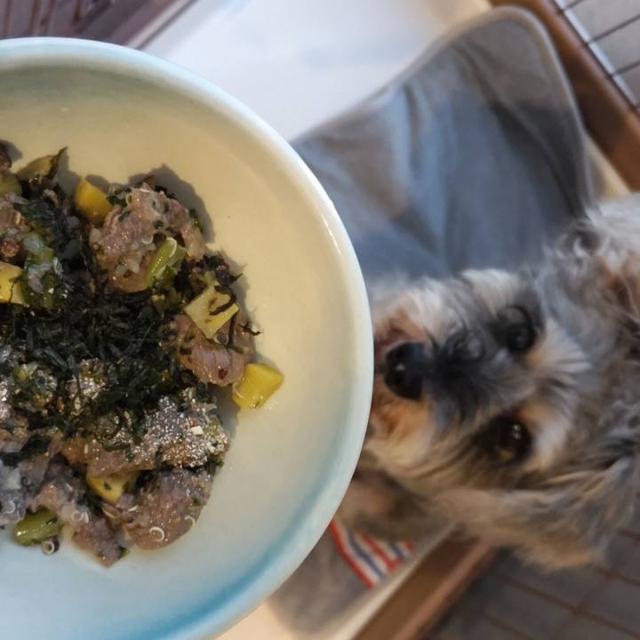 今日のご飯、黒いね😆💦四万十川海苔on馬肉です♪#シュナウザー