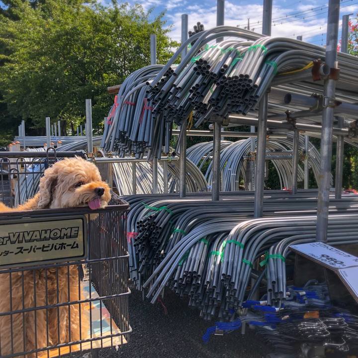 大福ガーデンのバラのアーチはこういう農業資材にペンキ塗って組み立ててるんだよー🐶