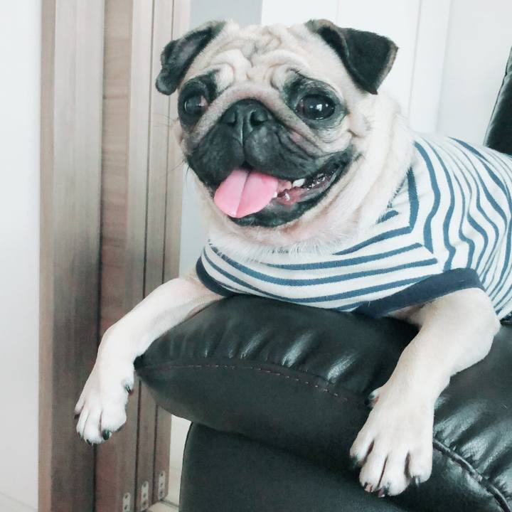 遊んで疲れたからちょっと休憩。ソファの肘掛けが定位置。#パグ #ペチャ