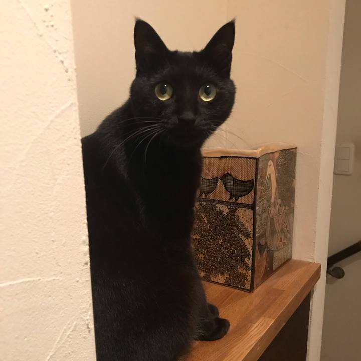 踊り場で 待ち受けていて 振り返る #黒猫 #ねこ句