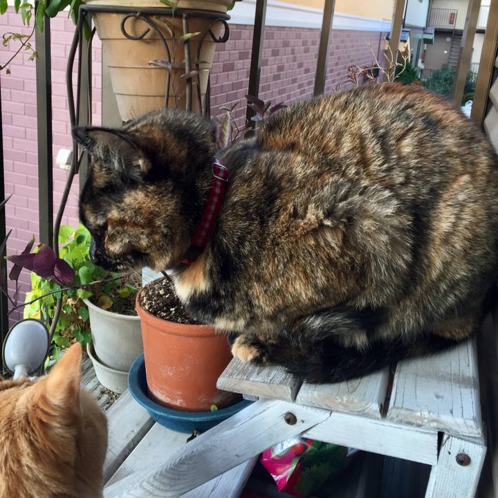 寒くて、真ん丸に縮こまってニャルソック。ベランダは寒すぎ…。 #サビ#茶トラ白