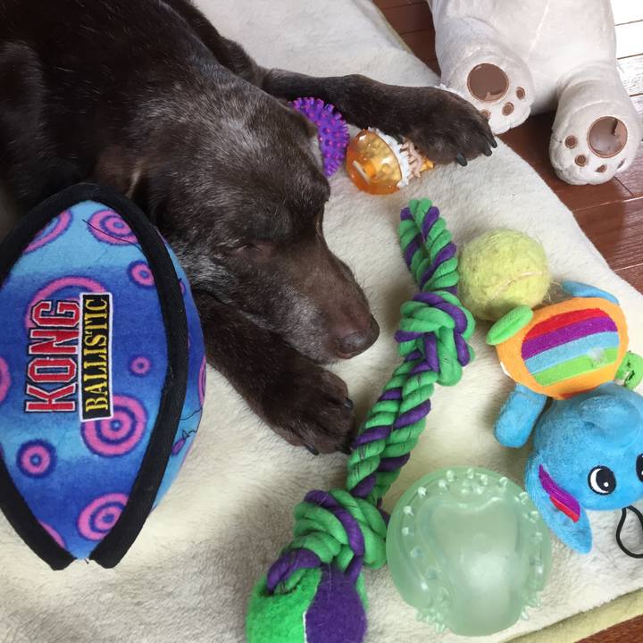 #ラブラドール#チョコラブ 今のカノンは おもちゃに やっつけられています💥
