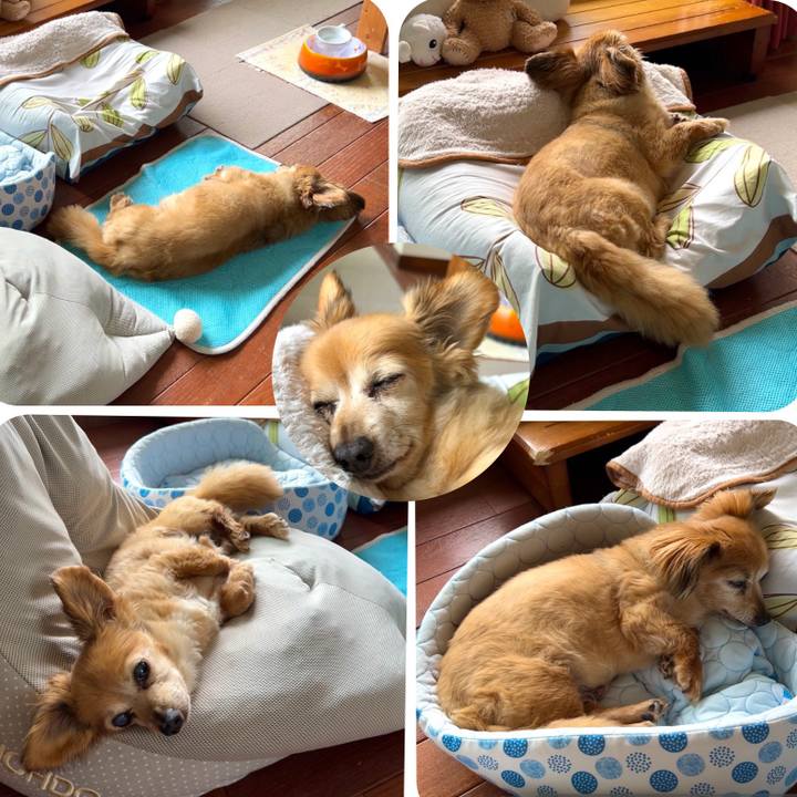 リビングに6箇所の寝床があります🛏️🐾 順番に寝ています。おじいさんの健康法?🐶