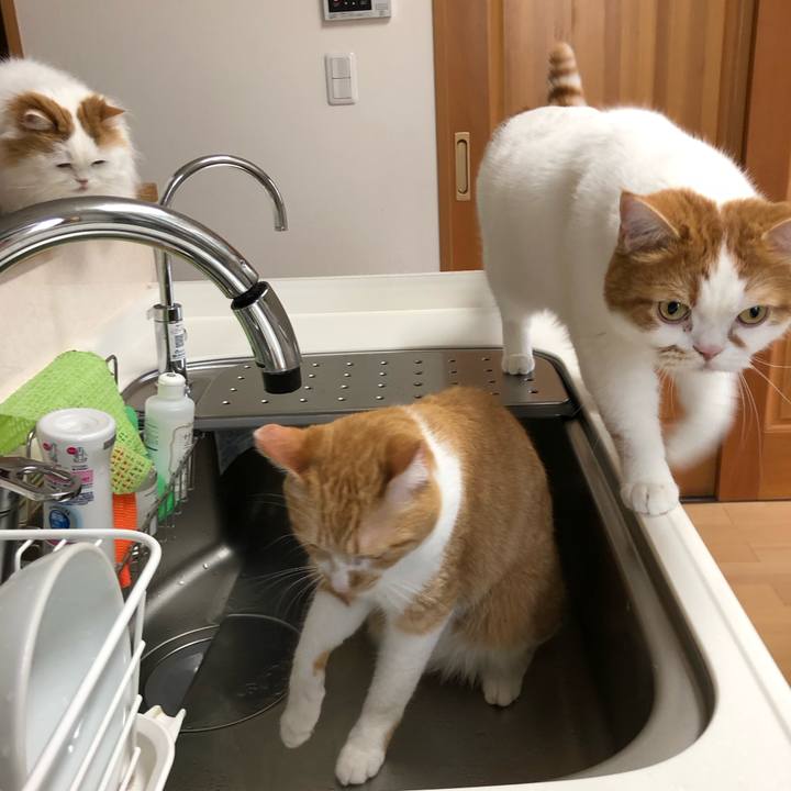 うはよう 今朝のフォーメーション #ハチワレ #茶白 #シンク隊 #ずんずん