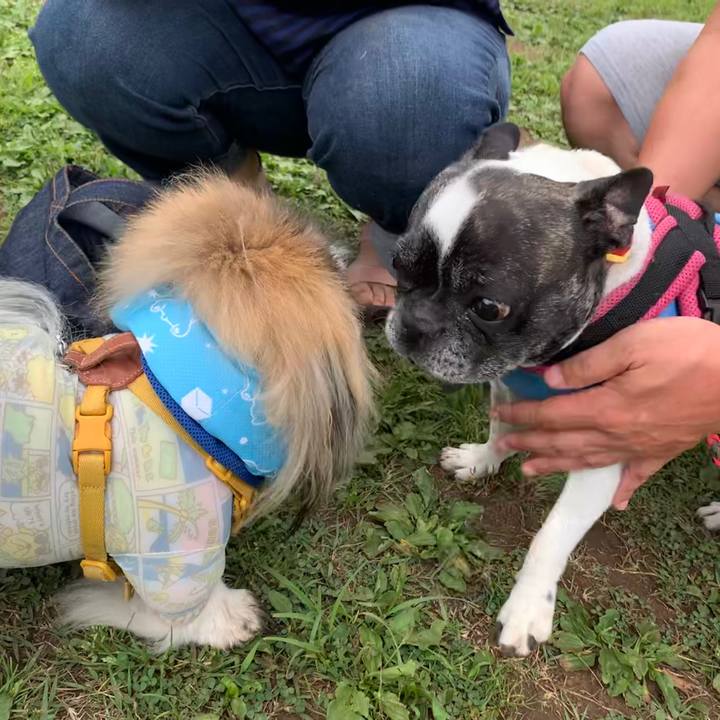 爆毛に怖気づくブリちゃん#フレンチブルドッグ#ペキニーズ#さんぽ#ドコノコ4周年