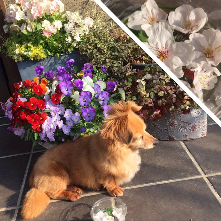 #チワックス#ミックス犬#桜 朝日を浴びようプロジェクト🌞 拾った桜でお花見も🌸