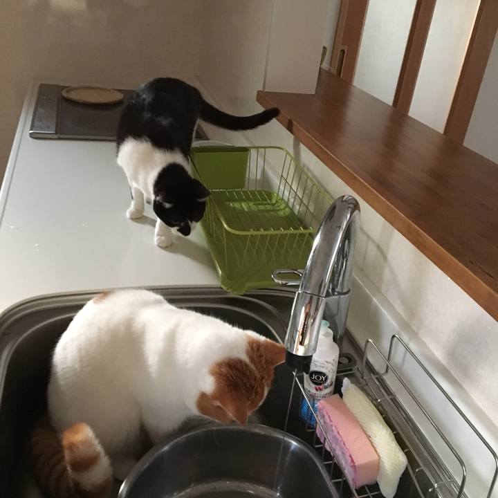 うはよう。今朝のフォーメーション。 #シンク隊 #茶白 #白黒