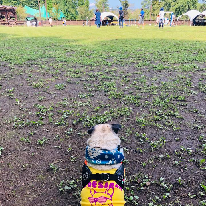 ドッグランでランしないドッグ #パグ #飽きたらしい #綺麗にお座り