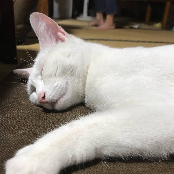 野外活動から戻ってごはん食べてしばし小休止💤 #白猫 #チーム白猫