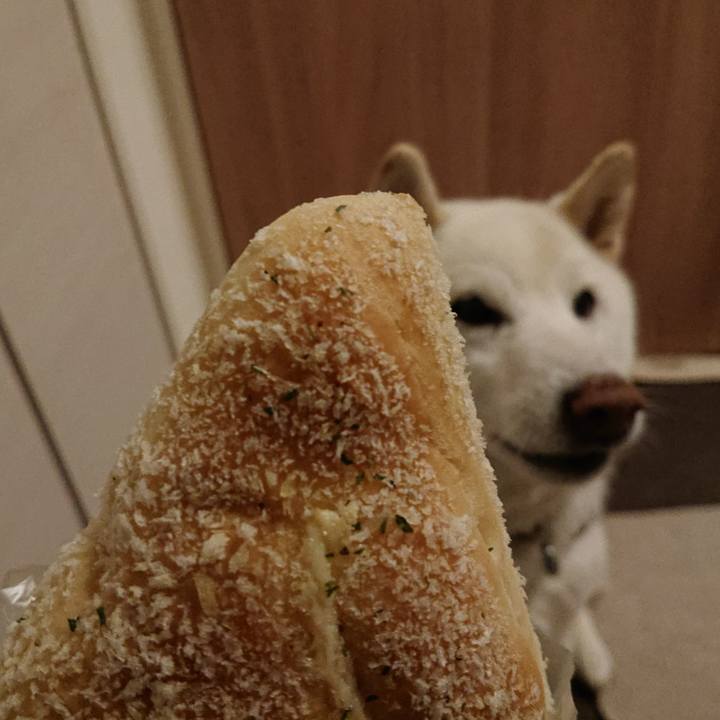 ロン)もしや… #柴犬#白柴#クリスマスの朝#スッペシャルなん#ハムチーズパン