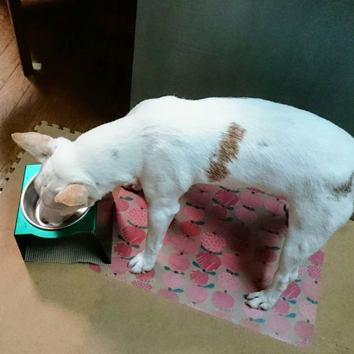 あれ!定位置からズレてくーー! 四つ足踏ん張り 勢いある食べっぷり🐶💕