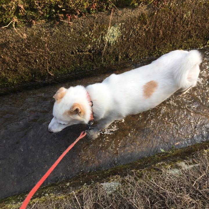 暑い朝は用水にドボン#白犬#雑種#里親