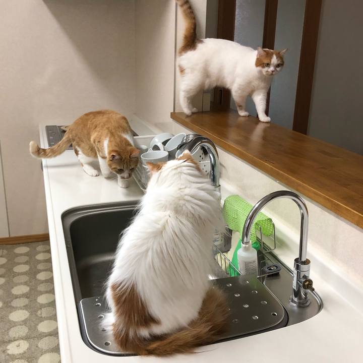 うはよう 今朝のフォーメーション #茶白 #ハチワレ #水修行 #シンク隊