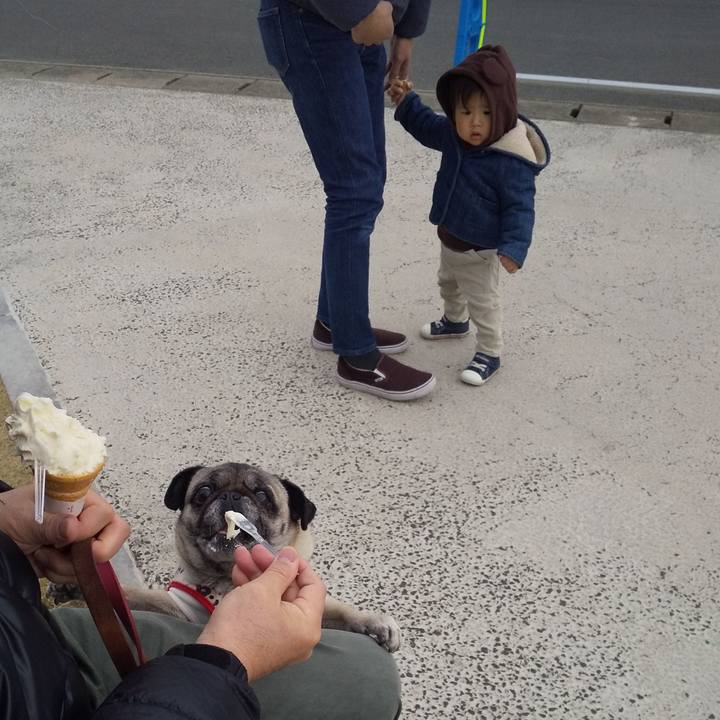 梅子のソフトクリーム🍦ぼくちゃんがうらやましそう😃#パグ