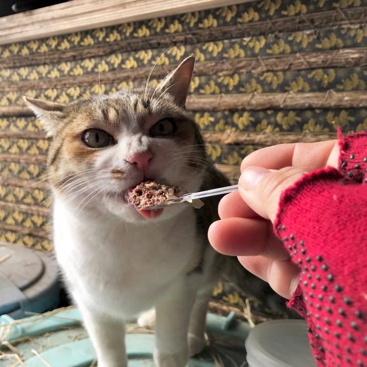 缶詰めモグ〜🎶 #牛小屋猫 #三毛猫 #缶詰めモグモグ