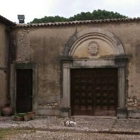 7世紀建立 ファルファ大修道院の中庭で遊ぶ豆犬