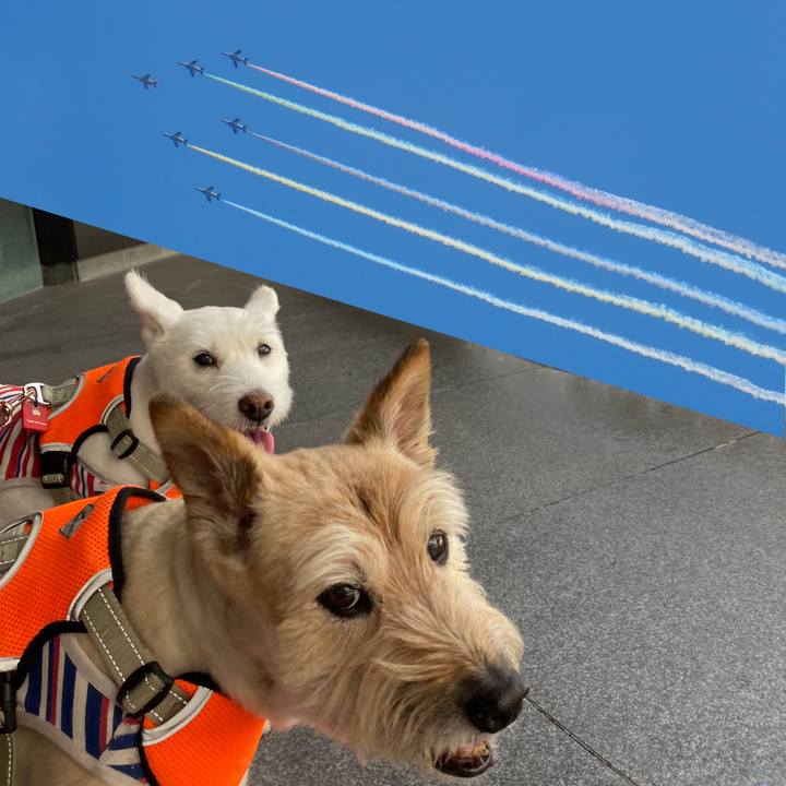屋根の上に登りブルーインパルス✈︎見ました。おやじが😅屋根は手すりがなく→