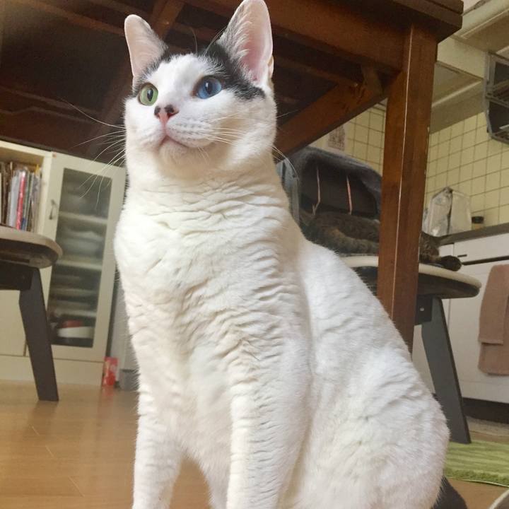 みんニャ〰おはようさんです〰😸 #ヅラ猫 #ハチワレ #オッドアイ