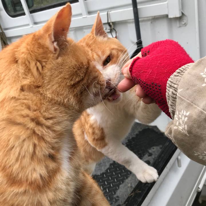 …と思ったら虎太朗の爪が刺さりました💧 #牛小屋猫 #缶詰めモグモグ #ボス猫