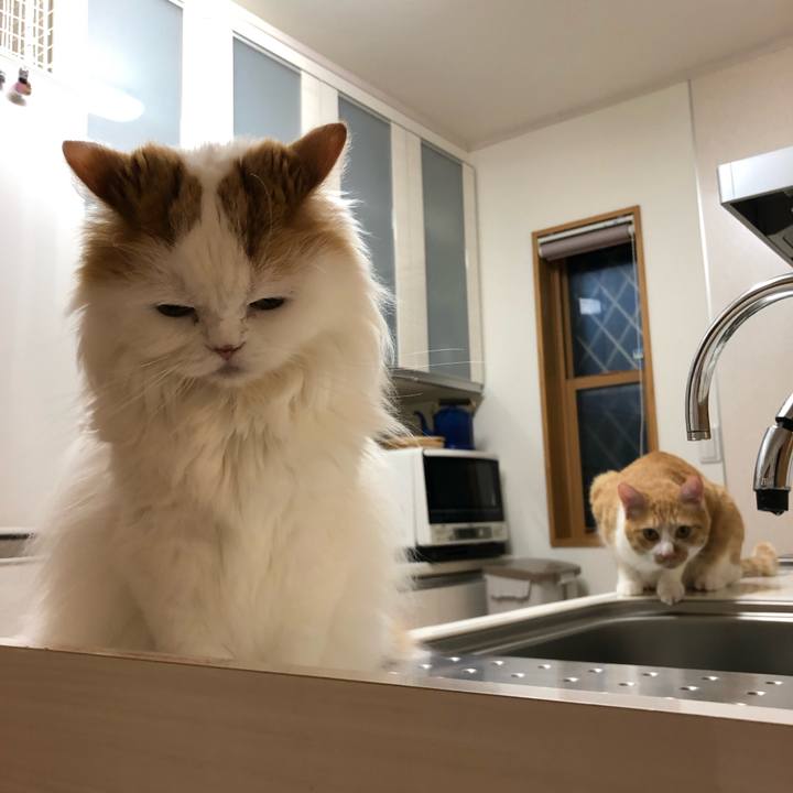 うはよう 今朝のフォーメーション #茶白 #ハチワレ #子猿 #シンク隊